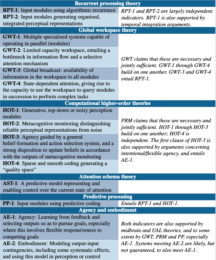 The paper identifies specific "indicator properties" from these theories that could serve as a rubric for assessing whether an AI system could potentially be conscious (Table 1). These indicators include recurrence, global broadcasting, metacognitive monitoring, attention modeling, and prediction error minimization. For example, from RPT, the indicator could be the system's ability to update information in a recurrent loop. From GWT, it could be the system's capacity to make information available to multiple simulated cognitive processes. And from IIT, it could be the level of informational integration within the system.
