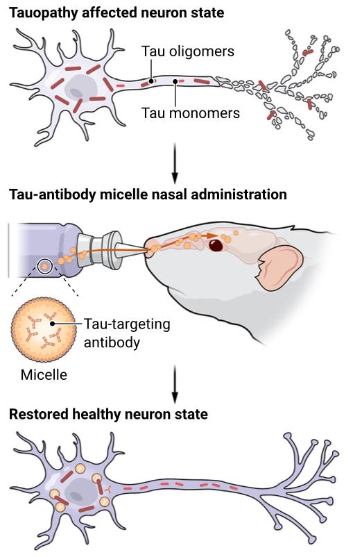 Previously, we have discussed the shortcomings of the amyloid plaque theory of Alzheimer’s disease. An alternative theory indicates intracellular Tau could be a contributor to this disease. In a recent study, scientists developed a monoclonal antibody called TTCM2 that targets toxic tau oligomers associated with Alzheimer’s disease (Meftah et al, 2024). Traditionally, tau-targeting therapies have struggled to reach neurons in the brain due to the blood-brain barrier. However, the researchers overcame this obstacle by packaging TTCM2 in micelles and delivering it intranasally, allowing the antibody to bypass the blood-brain barrier and directly enter the brain through the nasal mucosa.