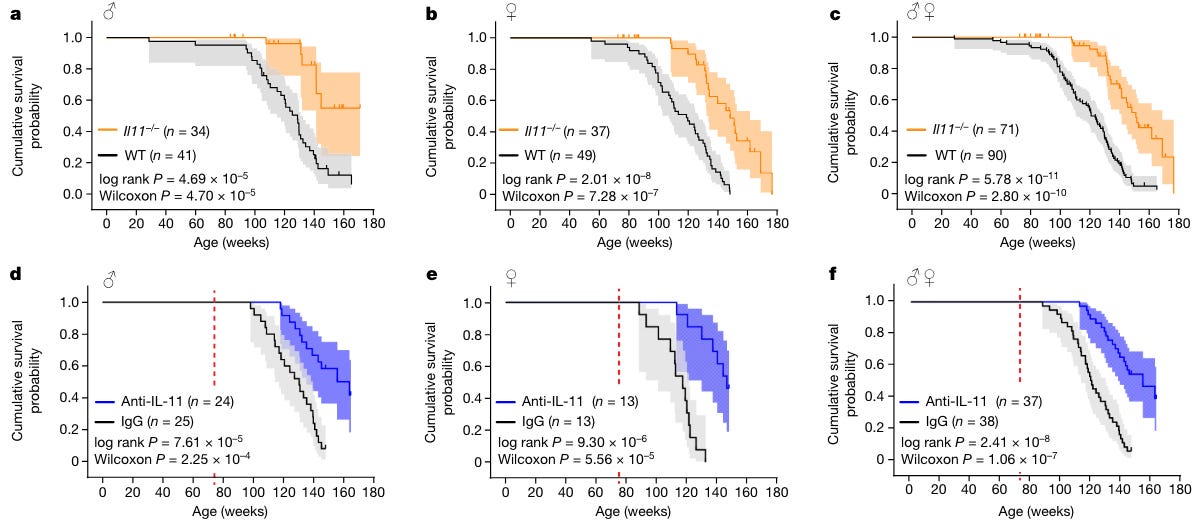 Widjaja, A.A., Lim, W.W., Viswanathan, S., Chothani, S., Corden, B., Dasan, C.M., Goh, J.W.T., Lim, R., Singh, B.K., Tan, J. and Pua, C.J., 2024. Inhibition of IL-11 signalling extends mammalian healthspan and lifespan. Nature, pp.1-9.