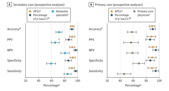 Alzheimer's disease (AD) remains a significant challenge in early diagnosis and effective treatment, but recent advancements have introduced a promising blood test that measures key proteins associated with AD pathology (Palmqvist et al, 2024). The test focuses on plasma phosphorylated tau 217 (p-tau217) and amyloid-beta (Aβ) ratios, two proteins that play a critical role in the disease's progression by forming neurofibrillary tangles and amyloid plaques in the brain, respectively. By combining these measures into an amyloid probability score (APS2), the test achieves high diagnostic accuracy (88%-92%) across both primary and secondary care settings. This innovation marks a substantial step forward, potentially transforming how AD is diagnosed by enabling earlier detection and more precise treatment strategies. The implications are particularly significant given the limitations of current diagnostic methods, which often miss early signs of the disease, especially in primary care settings where most patients are first evaluated.