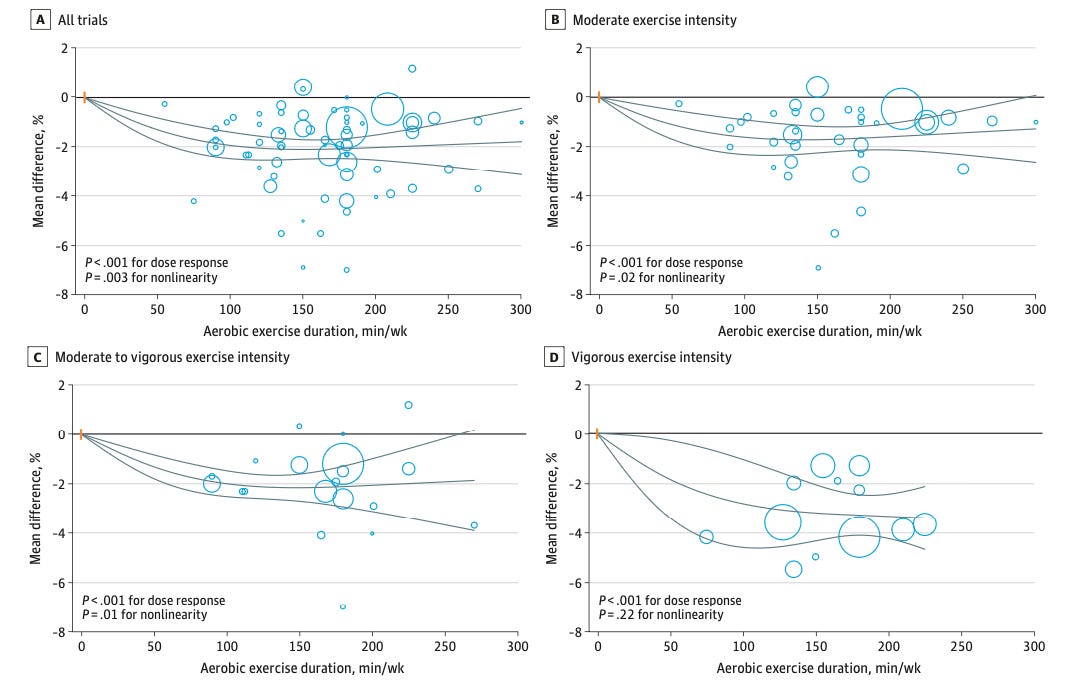 Lucky for us, a new systematic review and dose-response meta-analysis published in JAMA Network Open answers these questions and more (Jayedi et al., 2025). This “study of studies” consolidates data from 116 randomized clinical trials involving 6,880 participants to explore how different levels of aerobic activity influence body weight, waist circumference, and body fat percentage.