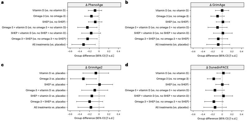 Bischoff-Ferrari, H.A., Gängler, S., Wieczorek, M., Belsky, D.W., Ryan, J., Kressig, R.W., Stähelin, H.B., Theiler, R., Dawson-Hughes, B., Rizzoli, R. and Vellas, B., 2025. Individual and additive effects of vitamin D, omega-3 and exercise on DNA methylation clocks of biological aging in older adults from the DO-HEALTH trial. Nature Aging, pp.1-10.