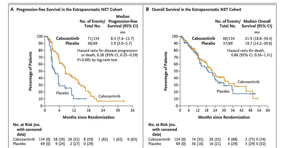 A newly published New England Journal of Medicine study has reignited debate over oncology trial design and the real-world utility of targeted therapies. The CABINET trial, funded by the National Cancer Institute (NCI), investigated cabozantinib, a multi-kinase inhibitor, in patients with advanced neuroendocrine tumors (NETs) (Chan, et al., 2024). The randomized, placebo-controlled phase 3 trial enrolled 298 patients with progressive pancreatic or extra-pancreatic NETs, assigning them 2:1 to either cabozantinib (60 mg daily) or placebo. The results were statistically significant: cabozantinib extended progression-free survival (PFS) from 3.9 months to 8.4 months in extra-pancreatic NETs and from 4.4 months to 13.8 months in pancreatic NETs. However, despite delaying tumor progression, the drug failed to improve overall survival (OS), raising critical questions about its true clinical impact. Furthermore, toxicity was substantial, with 62-65% of patients experiencing grade 3 or higher adverse events, including hypertension, fatigue, and diarrhea.