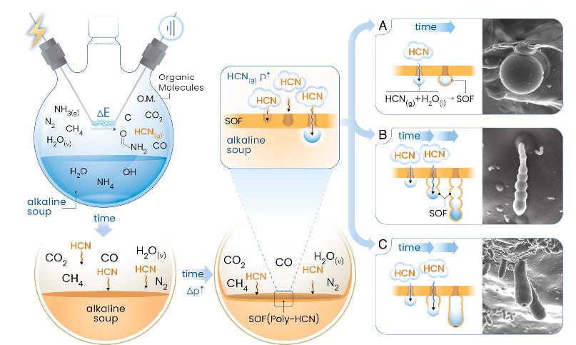 A key aspect of this study is its challenge to conventional prebiotic models. Traditionally, scientists have treated the synthesis of life’s molecular building blocks (e.g., amino acids, nucleotides) and cellular compartmentalization as distinct events, separated in time and space. Here, however, both processes occurred simultaneously, suggesting that life’s emergence may have been more spontaneous and inevitable than previously thought. The protocells formed via a bubble-driven mechanism, in which polymerized hydrogen cyanide (HCN) self-assembled into hollow biomorphic structures at the water-gas interface. These compartments could have concentrated prebiotic molecules, setting the stage for self-replicating chemical systems.