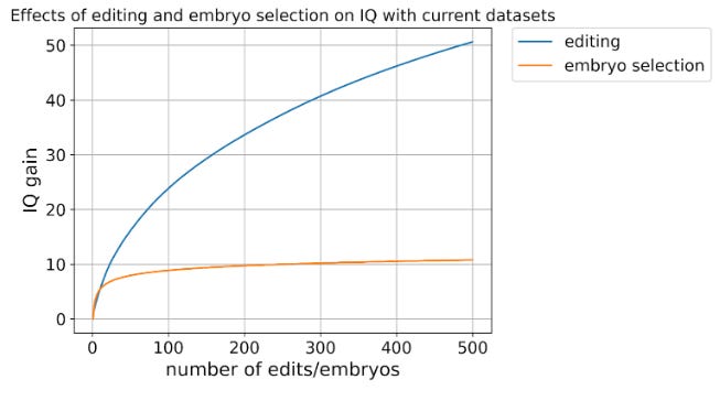 Could there be a benefit of choosing specific embryos for implantation based on their genetic makeup? Right now, embryo selection companies like Heliospect claim that they can already offer parents a slight edge by helping them choose embryos based on traits like intelligence or disease resistance, potentially adding around 3-7 IQ points or a few healthy years to a child's life. A simulation of these enhancements through embryo selection based on available embryos seems to indicate that improvement could be made with a greater selection, but overall, this levels off fairly quickly. The authors claim that to make real leaps, they would need to directly edit genes.