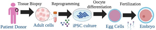 Infertility affects a significant portion of the global population, posing emotional, physical, and sometimes social challenges to those who experience it. In a previous article, we reviewed how IVF has emerged as a powerful tool for treating infertility. Furthermore, we discussed the overall process of IVF, which is summarized in Figure 1. This begins with the stimulation and retrieval of egg cells from a prospective woman and ends with their fertilization and postimplantation for embryo development. Unbeknownst to me at the time of writing the original article, the procedure of egg retrieval can be quite invasive and even painful (Nakagawa et al., 2015)! Furthermore, the harvested oocytes are typically the rate-limiting material for IVF procedures, where only between 7-15 oocytes are harvested per treatment cycle. However, this bottleneck could become a thing of the past thanks to iPSCs.