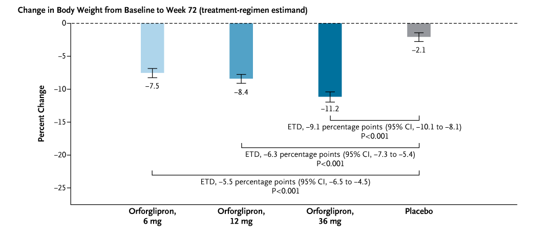 Meanwhile, Eli Lilly’s orforglipron, the first non-peptide (small-molecule) GLP-1 receptor agonist in pill form also made headlines. Orforglipron phase 3 (ATTAIN‑1) showed dose‑dependent weight reduction at 72 weeks (highest dose ~−11.2% vs −2.1% placebo), with “nearly one fifth” of participants at the highest dose reaching ≥20% weight loss; adverse events were predominantly gastrointestinal and usually mild‑to‑moderate (Wharton et al., 2025).