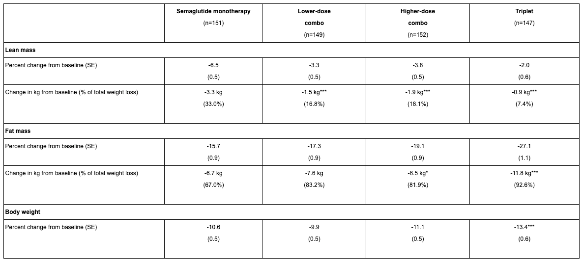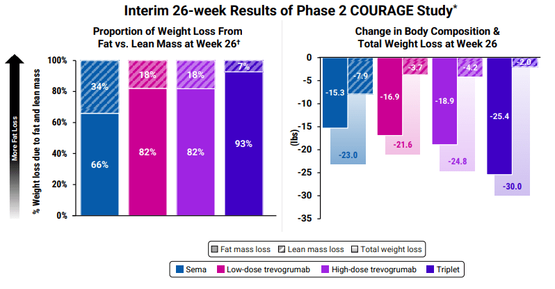 Similar results are being observed in Regeneron’s Courage Trial, a 26-week study combining semaglutide with Trevogrumab (anti-GDF8/myostatin) and/or Garetosmab (anti-activin A) for treating obesity (Regeneron Press). Early results reflect what is seen with Bimagrumab and Semiglutide, i.e., maintain more lean muscle mass and lose additional fat mass. However, even without adjunct therapy, newer drugs are being evaluated for their impact on body composition. For example, retatrutide’s trials included a body composition substudy that showed minimal lean mass loss despite massive fat reductions. The emphasis on “quality” of weight loss, maximizing fat reduction while maintaining muscle, is now front and center in obesity pharmacology.