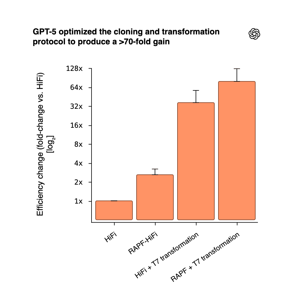 The landmark example came from OpenAI’s collaboration with biosecurity startup Red Queen Bio: using GPT‑5, the team built a closed-loop framework where the LLM proposed experimental protocols that human scientists executed, feeding results back to the model. Through iterative refinement, GPT‑5 optimized a standard molecular cloning procedure by a factor of 79 – an unprecedented gain. Notably, the model’s suggestions were not simply copied from literature; it introduced new elements (like adding E. coli RecA recombinase and a phage DNA-binding protein to the DNA assembly process) that hadn’t been used in that protocol, leading to dramatically higher yields. Researchers observed that GPT‑5 integrated known biological mechanisms in a novel way, showing “glimpses of creativity” beyond what its training data alone would predict. While not a fundamental discovery in biology, this achievement proved that an LLM can drive experimental innovation in the lab, not just analyze text