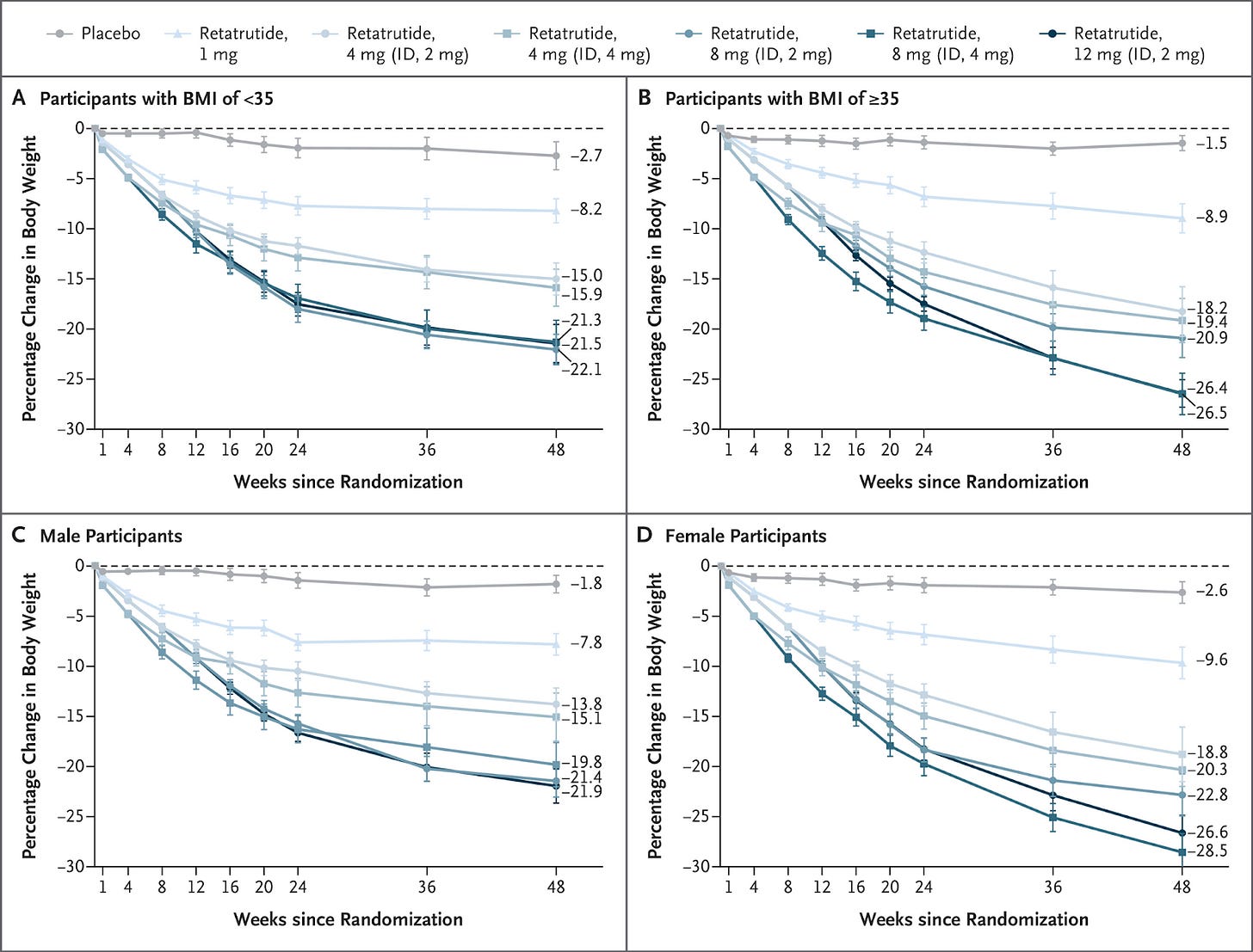 Changes in Body Weight with Retatrutide as Compared with Placebo (Jastreboff et al. 2023).