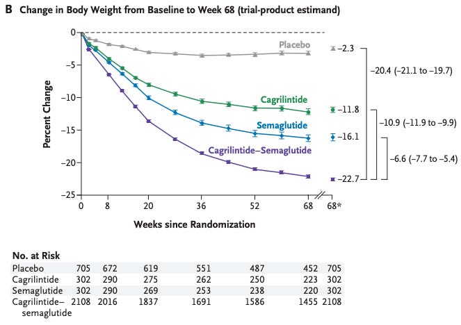 Change in Body Weight with Cagrilintide–Semaglutide as Compared with Semaglutide, Cagrilintide, and Placebo (Garvey et al., 2025).