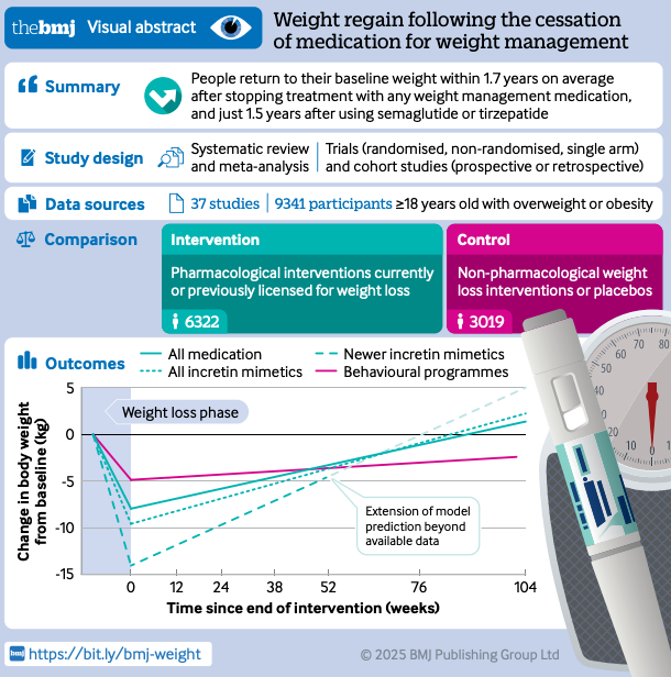 West, S., Scragg, J., Aveyard, P., Oke, J.L., Willis, L., Haffner, S.J., Knight, H., Wang, D., Morrow, S., Heath, L. and Jebb, S.A., 2026. Weight regain after cessation of medication for weight management: systematic review and meta-analysis. bmj, 392.
